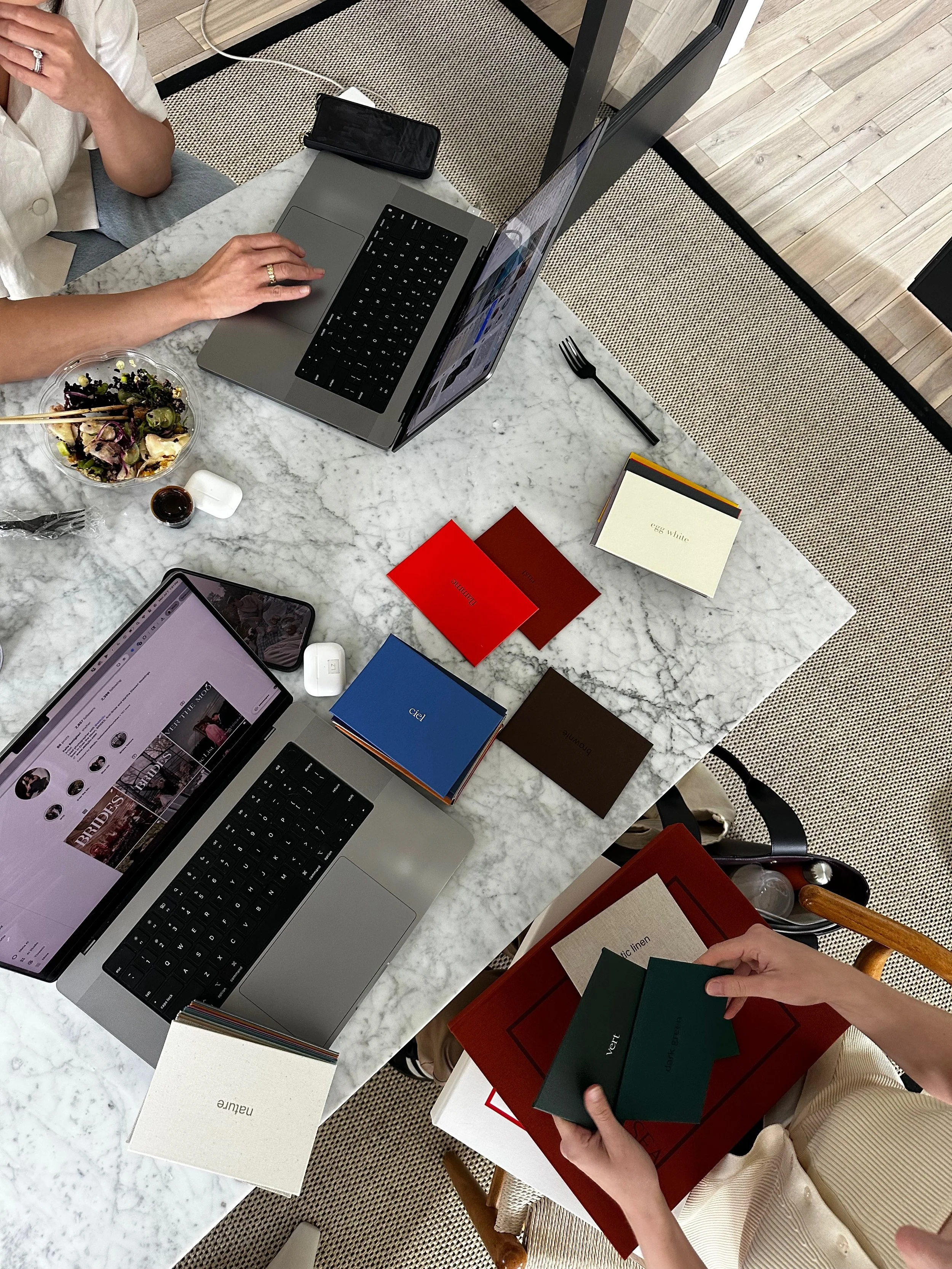 Each album’s layouts are created by our internal team, and you’ll receive a first draft to review and request changes. Once those initial edits are made, your photographer will set up a video call (about an hour) to present the updated design and work with you in real time via screen sharing to fine-tune every detail. This is also when you’ll finalize color choices for the album and box front.